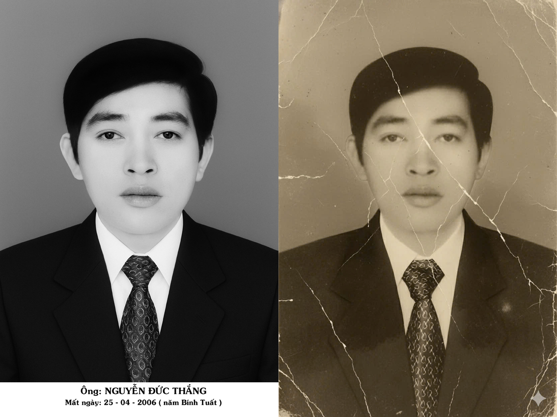 Với đội ngũ chuyên gia chỉnh sửa ảnh có kinh nghiệm lâu năm cùng công nghệ phục chế ảnh hiện đại nhất, chúng tôi giữ nguyên thần thái, nụ cười và ánh mắt người thân, đồng thời làm rõ từng chi tiết khuôn mặt, phục hồi màu sắc và chỉnh lại phông nền trang trọng, phù hợp để làm ảnh thờ cao cấp.
