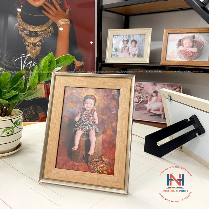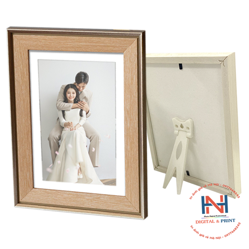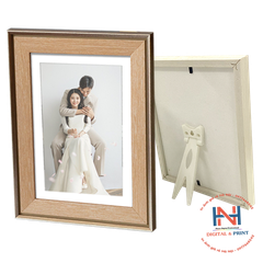 Khung ảnh gỗ để bàn được in bằng giấy in chính hãng Fujifilm bền màu trên 50 năm , được ép các chất liệu bề mặt :