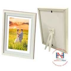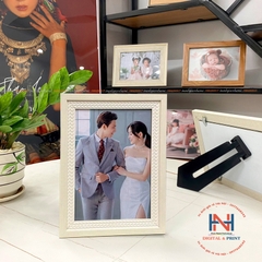 Khung ảnh gỗ để bàn được in bằng giấy in chính hãng Fujifilm bền màu trên 50 năm , được ép các chất liệu bề mặt :