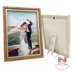Khung ảnh gỗ để bàn được in bằng giấy in chính hãng Fujifilm bền màu trên 50 năm , được ép các chất liệu bề mặt :