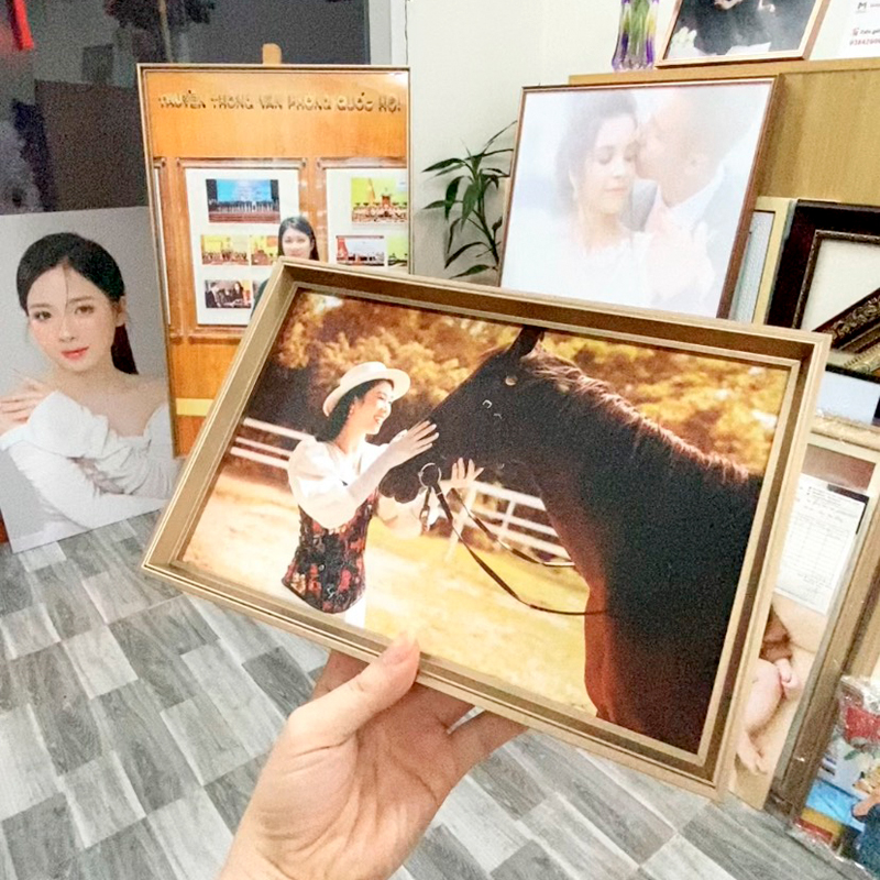 -Ảnh được in giấy in chính hãng Fujifim và ép lên gỗ lắp khung , độ bền màu trên 50 năm,ảnh được ép các chất liệu bề mặt :