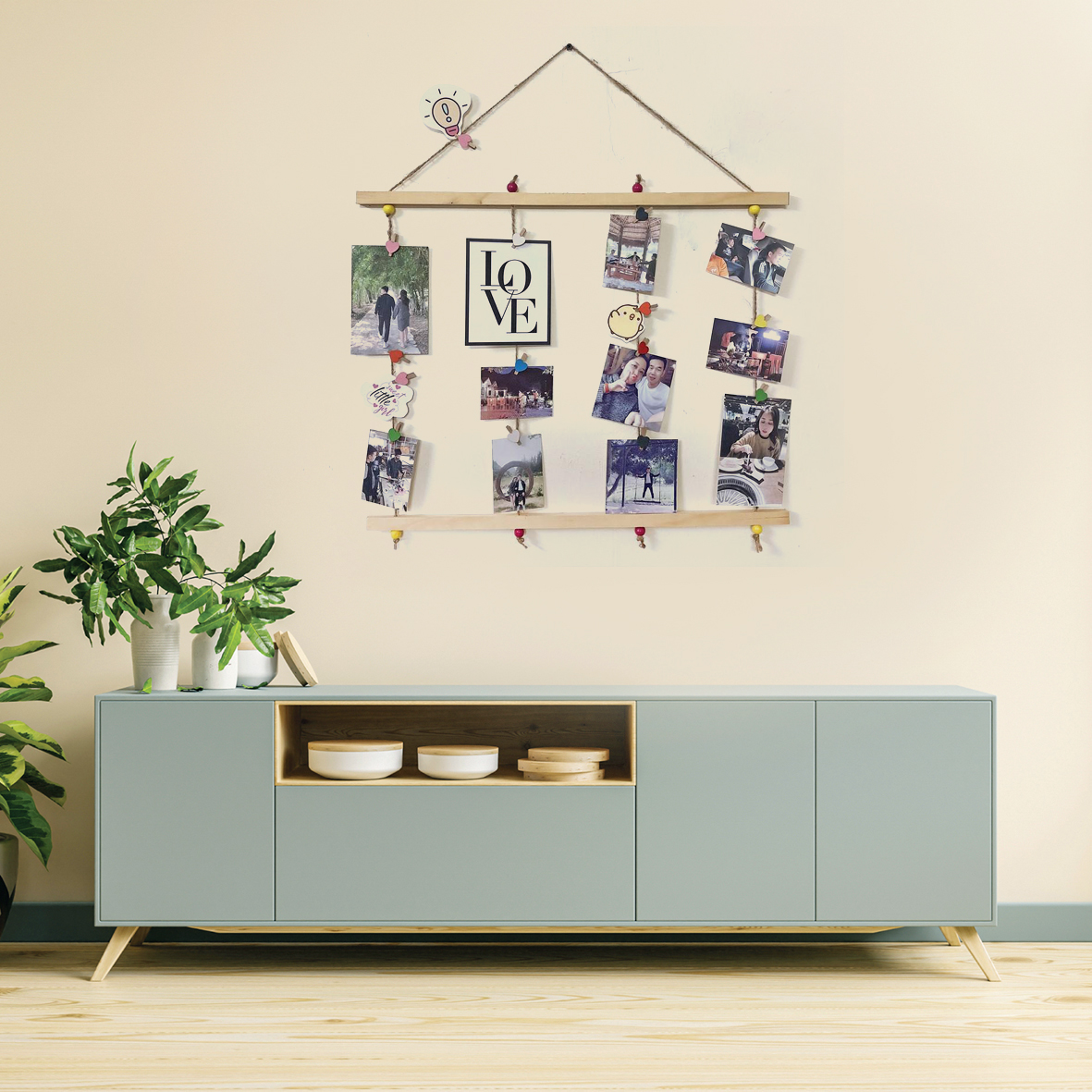 - Kẹp gỗ: Dùng kẹp gỗ để kẹp ảnh và treo lên dây thừng hoặc dây ruy băng. Bạn có thể cố định dây lên tường bằng đinh hoặc móc.