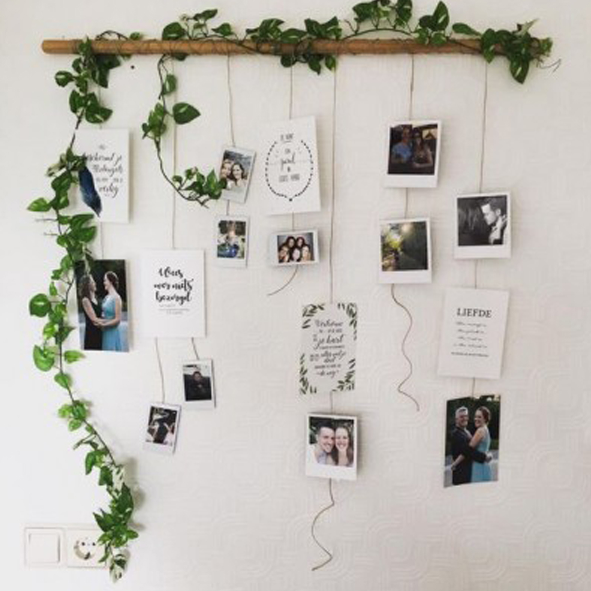 - Bố cục: Treo cành cây ngang hoặc dọc và kẹp ảnh lên bằng kẹp gỗ nhỏ.